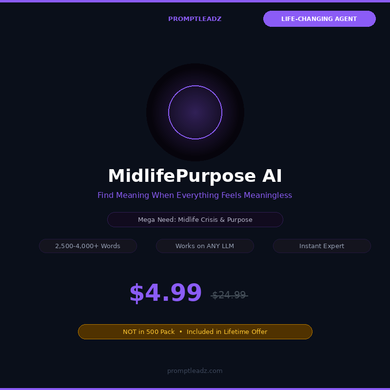 Is this it? That question haunts midlife. This AI agent helps you process the existential crisis, explore what actually matters to you, redesign your life around purpose, and turn the 'midlife crisis' into a midlife awakening.