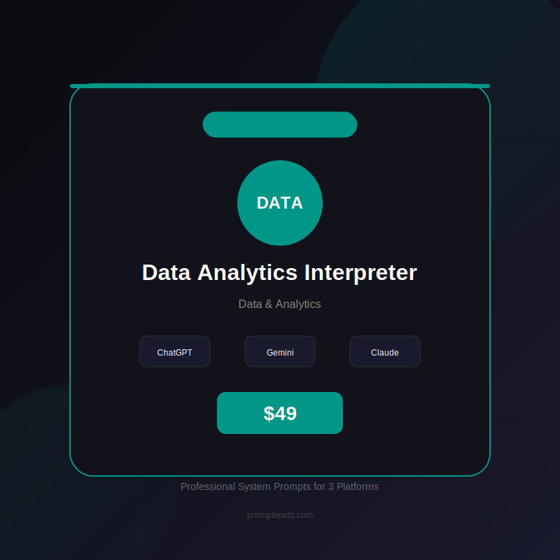 Erhalten Sie sofortigen Zugriff auf Ihren Data Analytics Interpreter KI-Agenten mit System-Prompts für ChatGPT, Gemini und Claude.