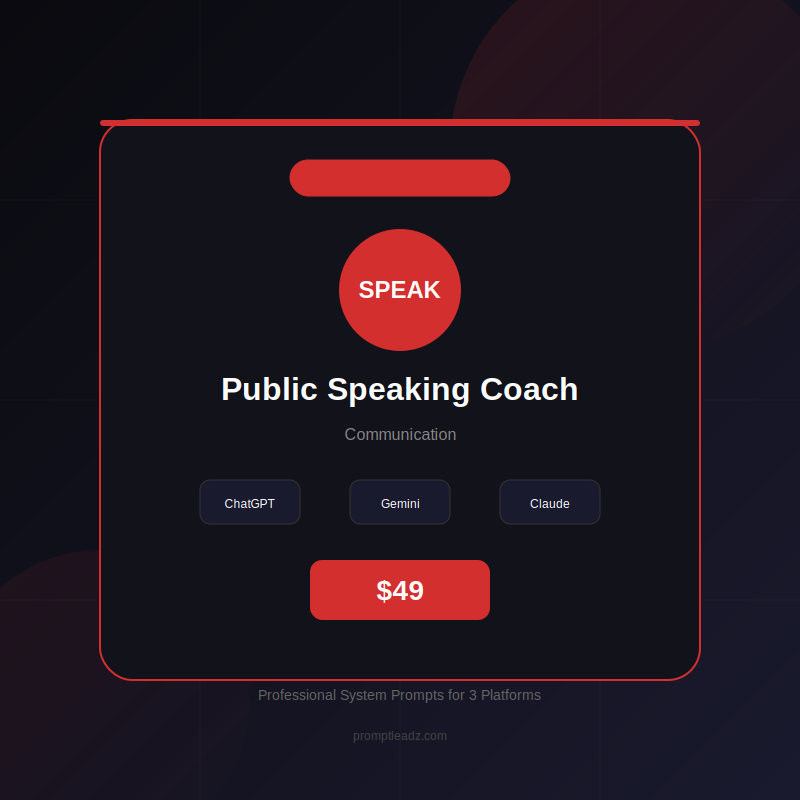 Obtenez un accès instantané à votre Agent IA Coach en Prise de Parole en Public avec des invites système pour ChatGPT, Gemini et Claude.