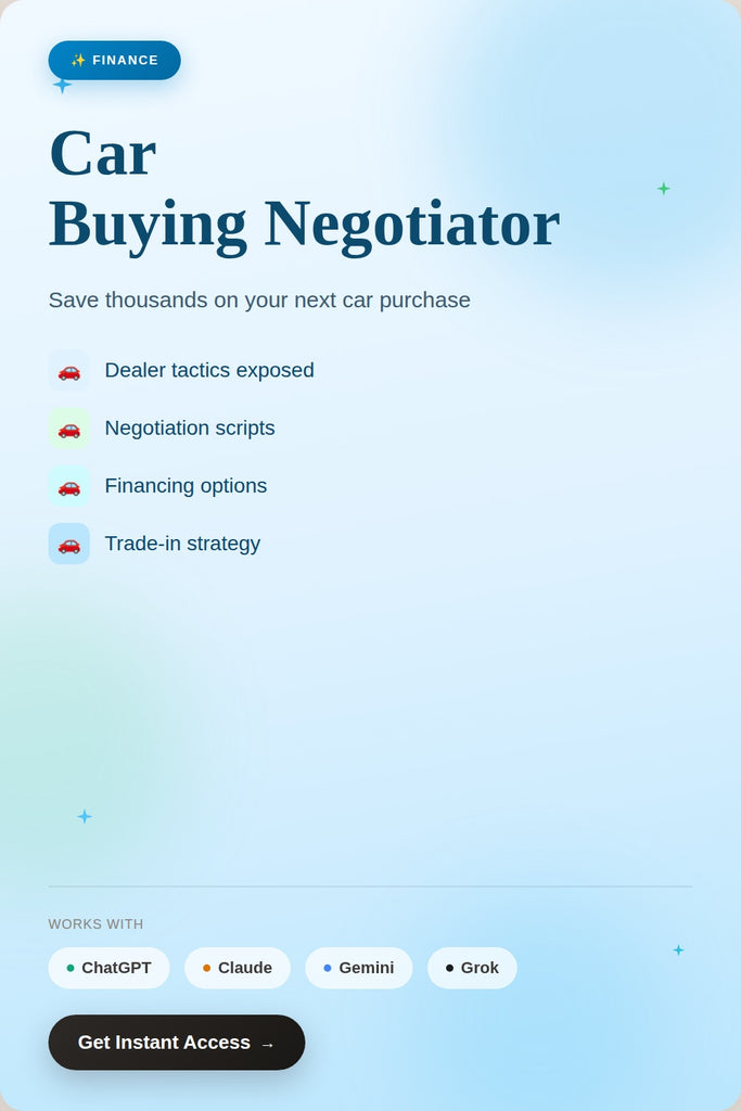 जब आप हमारा Car Buying Negotiator सिस्टम प्रॉम्प्ट किसी भी AI चैट में पेस्ट करते हैं, तो आपको तुरंत एक ऑटोमोटिव खरीद विशेषज्ञ तक पहुंच मिलती है जो डीलर की रणनीतियों को समझता है, वास्तविक मूल्य जानता है, और हर स्थिति के लिए शब्द-दर-शब्द स्क्रिप्ट देता है।