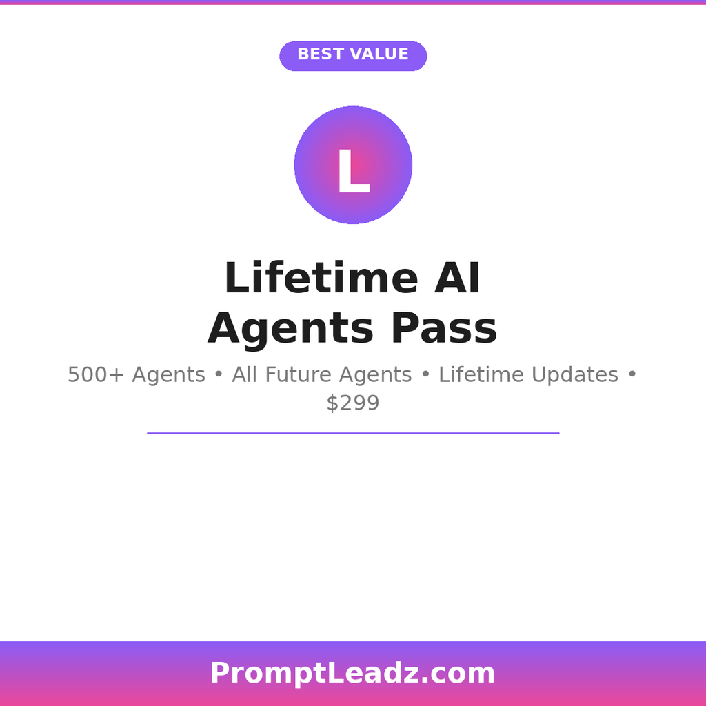 평생 이용권은 최고의 PromptLeadz 투자입니다. 현재 500개 이상의 모든 에이전트를 즉시 이용할 수 있으며, 앞으로 우리가 만드는 모든 신규 에이전트에 자동으로 접근할 수 있습니다. 라이브러리가 1,000개… 2,000개… 5,000개 에이전트로 성장해도 — 모두 이용할 수 있습니다. 추가 비용 없음. 구독 없음. 한 번의 결제로 완료.