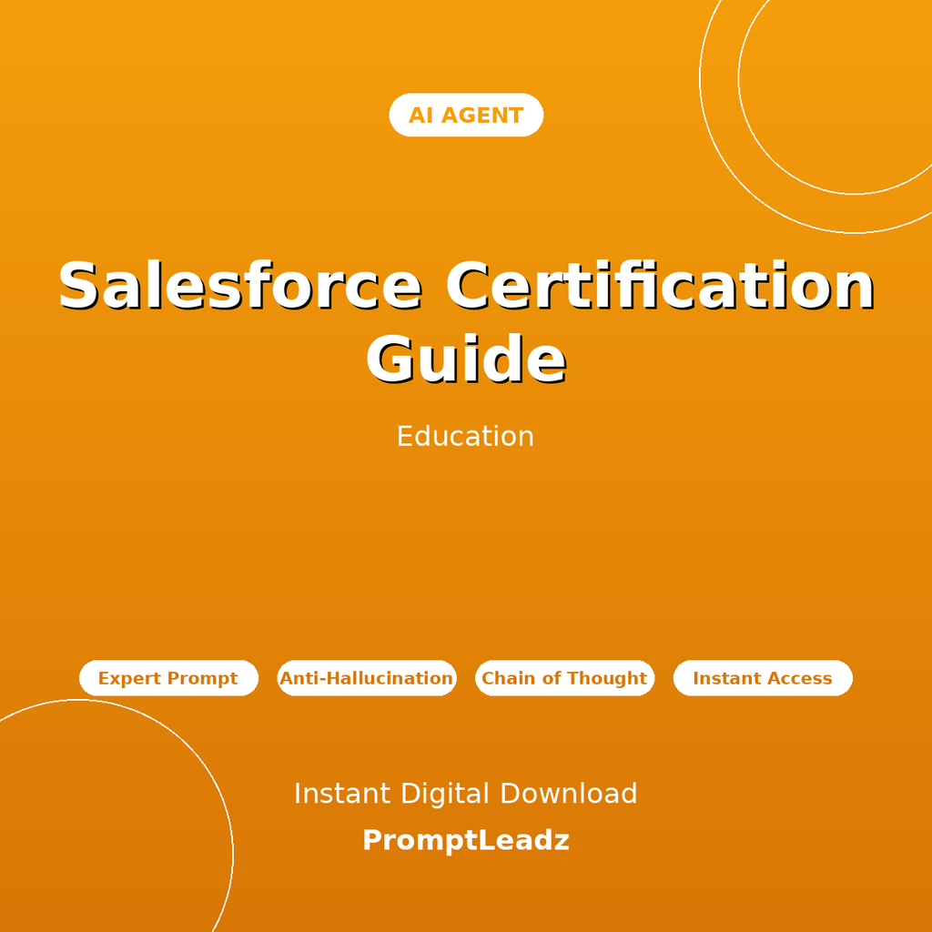 Uzyskaj natychmiastowe, eksperckie wskazówki dotyczące certyfikacji Salesforce, Salesforce Admin, Salesforce Developer oraz certyfikacji SF. Ten profesjonalnie przygotowany agent AI przekształca ChatGPT, Claude, Gemini lub Grok w twojego osobistego eksperta edukacyjnego.