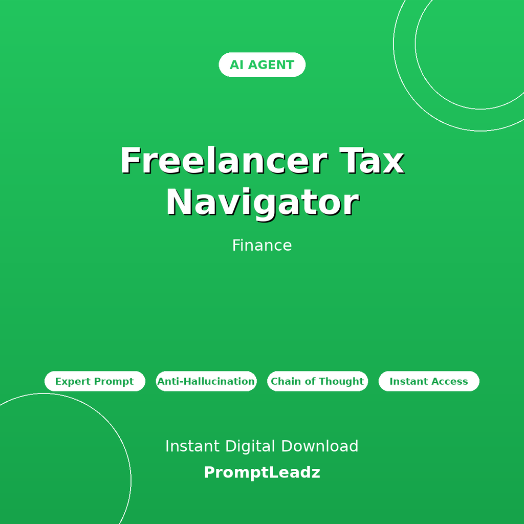 Uzyskaj natychmiastowe, eksperckie wskazówki dotyczące podatków od samozatrudnienia, kwartalnych zaliczek, odliczeń biznesowych, biura domowego i optymalizacji podatków freelancera. Ten profesjonalnie przygotowany agent AI przekształca ChatGPT, Claude, Gemini lub Grok w twojego osobistego eksperta finansowego.