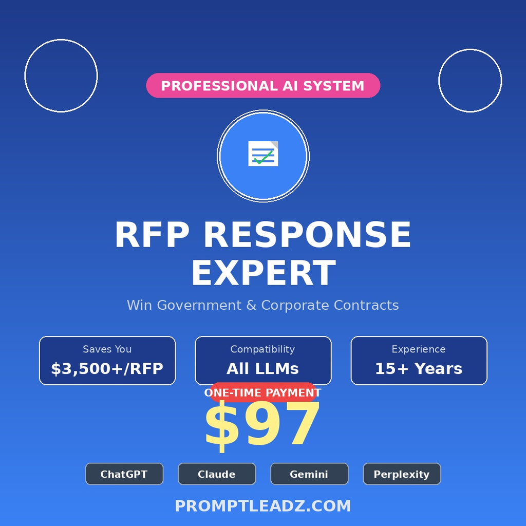 De flesta RFP-konsulter tar 3 500–7 500 USD för statliga förslag och 5 000–15 000 USD för komplexa RFP:er. Företagsteam slösar 27–38 timmar per svar. Detta system ger dig obegränsad tillgång till samma expertis för en engångsinvestering på 97 USD.