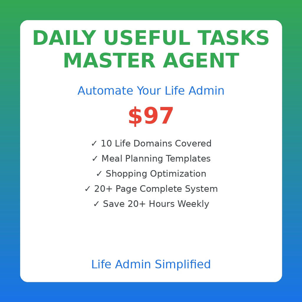 Ngừng bị ngập trong vô vàn công việc vặt và việc nhà. Hệ thống đại lý toàn diện hơn 20 trang này biến bất kỳ nền tảng AI nào thành Giám đốc Điều hành Cá nhân của bạn trong Cuộc sống - xử lý lập kế hoạch bữa ăn, mua sắm, du lịch, tài chính, quản lý nhà cửa và mọi công việc hàng ngày khác đang lấy đi thời gian và năng lượng tinh thần của bạn.