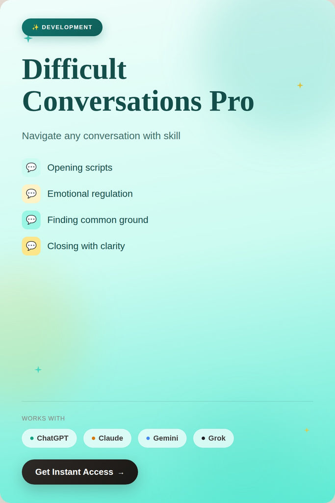 Một lời nhắc hệ thống biến các công cụ AI thành huấn luyện viên chuyên môn. Dán lời nhắc Difficult Conversations Pro của chúng tôi, và AI của bạn trở thành chuyên gia giao tiếp, soạn kịch bản các cuộc nói chuyện khó, dự đoán phản hồi, và giúp bạn nói những gì cần nói—rõ ràng và tử tế.