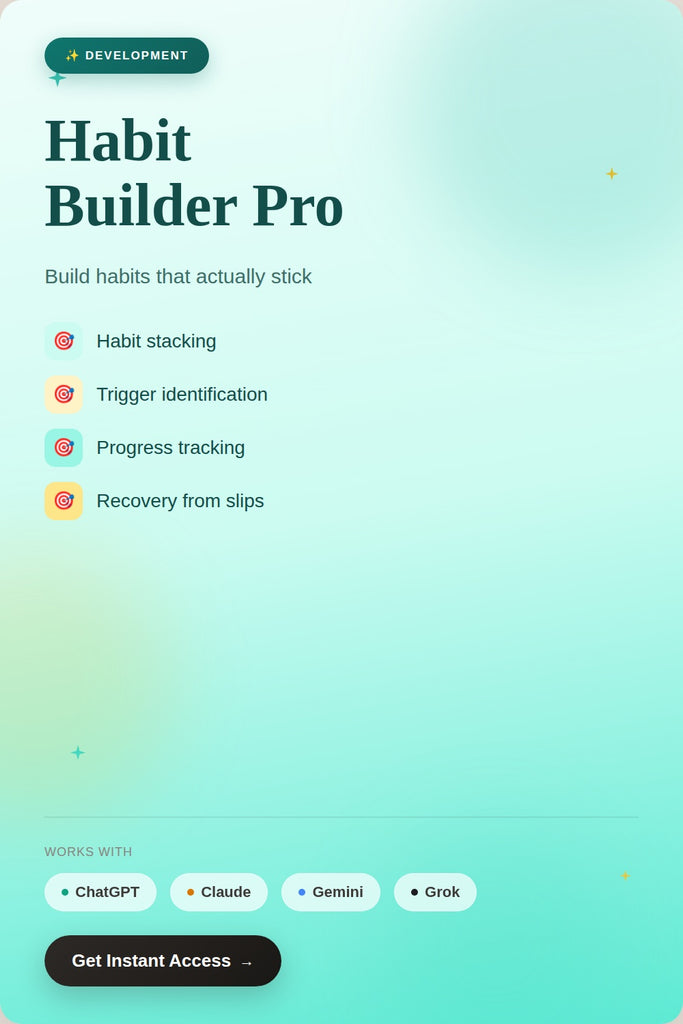 Một lời nhắc hệ thống biến các công cụ AI thành những huấn luyện viên chuyên biệt. Dán lời nhắc Habit Builder Pro của chúng tôi, và AI của bạn sẽ trở thành chuyên gia khoa học hành vi thiết kế các hệ thống thói quen cá nhân dựa trên cuộc sống, lịch trình và những trở ngại của bạn.