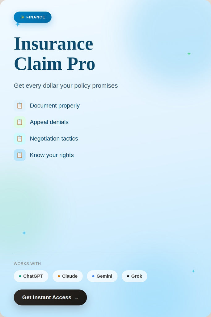 Khi bạn dán lời nhắc hệ thống Insurance Claim Pro của chúng tôi vào bất kỳ trò chuyện AI nào, bạn ngay lập tức có quyền truy cập vào một người đại diện khiếu nại biết cách các công ty bảo hiểm hoạt động, những chiến thuật họ sử dụng, và chính xác cách phản kháng—với các kịch bản từng chữ, thư kháng cáo và chiến lược đàm phán.