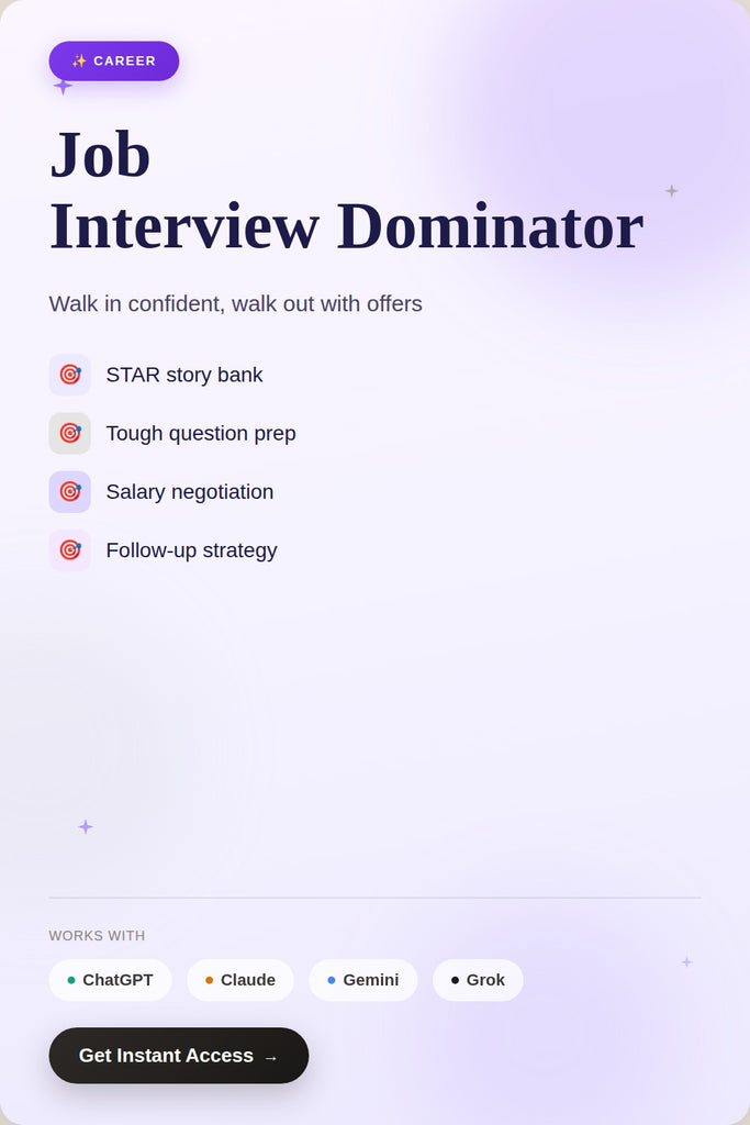 Ngừng thất bại trong các buổi phỏng vấn. Biến bất kỳ AI nào thành huấn luyện viên phỏng vấn cá nhân của bạn với luyện tập thử, phát triển câu trả lời và phản hồi chuyên gia.