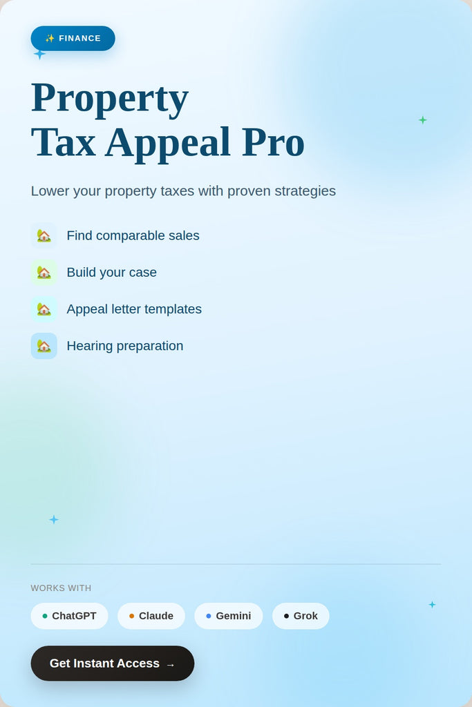 Giảm thuế tài sản của bạn từ $1,000-3,000+ mỗi năm với thư kháng cáo chuyên nghiệp, phân tích giá bán so sánh và các chiến lược đã được chứng minh mà các tư vấn thuế thường tính phí hàng trăm đô la.