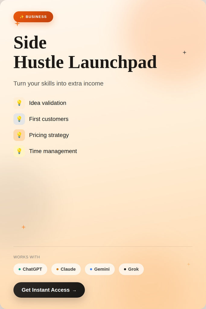 Chỉ cần dán lời nhắc, và AI của bạn sẽ trở thành một doanh nhân dày dạn kinh nghiệm sẵn sàng giúp bạn xác thực ý tưởng, tạo kế hoạch ra mắt, tìm khách hàng và phát triển—tất cả trong khi vẫn giữ công việc chính.