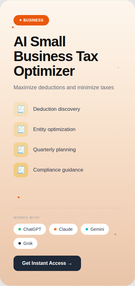 Chỉ cần dán prompt, và AI của bạn ngay lập tức trở thành chiến lược gia thuế cho doanh nghiệp nhỏ sẵn sàng hỗ trợ phân tích cấu trúc pháp nhân, tối ưu hóa khấu trừ, lập kế hoạch nghỉ hưu, và chiến lược thuế cuối năm.